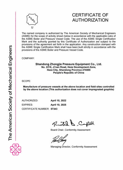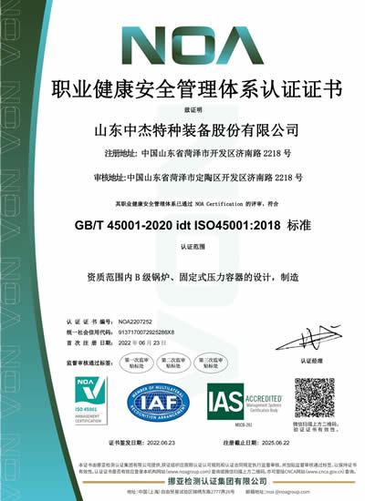 山東中杰特種裝備股份有限公司(原菏澤鍋爐廠有限公司)成立于1984年,公司先后被評(píng)為“高新技術(shù)企業(yè)”,“山東省專(zhuān)精特新企業(yè)”,“山東省瞪羚企業(yè)”,“山東省制造業(yè)單項(xiàng)冠軍企業(yè)”,2022年8月被工信部認(rèn)定為“國(guó)家專(zhuān)精特新小巨人企業(yè)”等榮譽(yù)。公司擁有自營(yíng)進(jìn)出口權(quán),具有A級(jí)鍋爐制造許可及A2級(jí)壓力容器制造許可資質(zhì),A2級(jí)壓力容器設(shè)計(jì)許可資質(zhì),B級(jí)鍋爐安裝和GB2類(lèi)、GC2類(lèi)壓力管道安裝許可資質(zhì)及三級(jí)機(jī)電設(shè)備安裝專(zhuān)業(yè)承包資質(zhì),是中國(guó)鍋爐與水處理協(xié)會(huì)會(huì)員單位、中國(guó)化工裝備協(xié)會(huì)會(huì)員單位和山東省裝備制造協(xié)會(huì)理事單位,并通過(guò)了ISO9001質(zhì)量管理體系、ISO14001環(huán)境管理體系、OHSAS18001職業(yè)健康安全管理體系認(rèn)證和美國(guó)ASME/U2認(rèn)證。